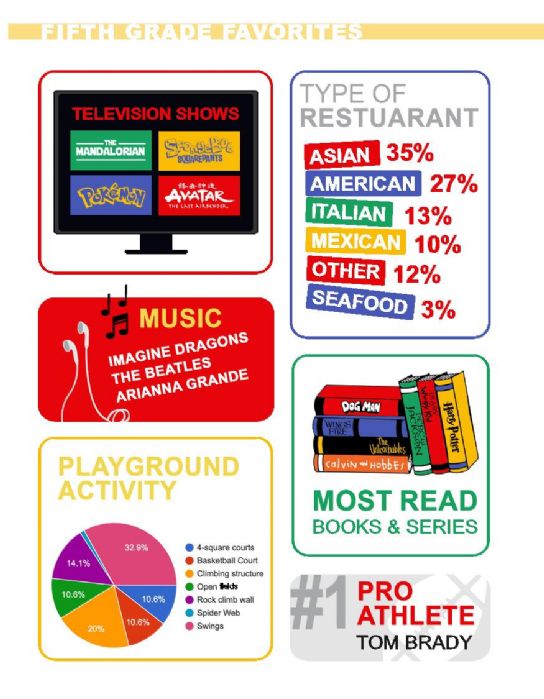 Entry Description: The students were asked about multiple class favorites and we wanted to capture their responses in a fun way, especially as this is an elementary school.. The idea of creating infographics seemed interesting and something they would be used to seeing in their classes now.
