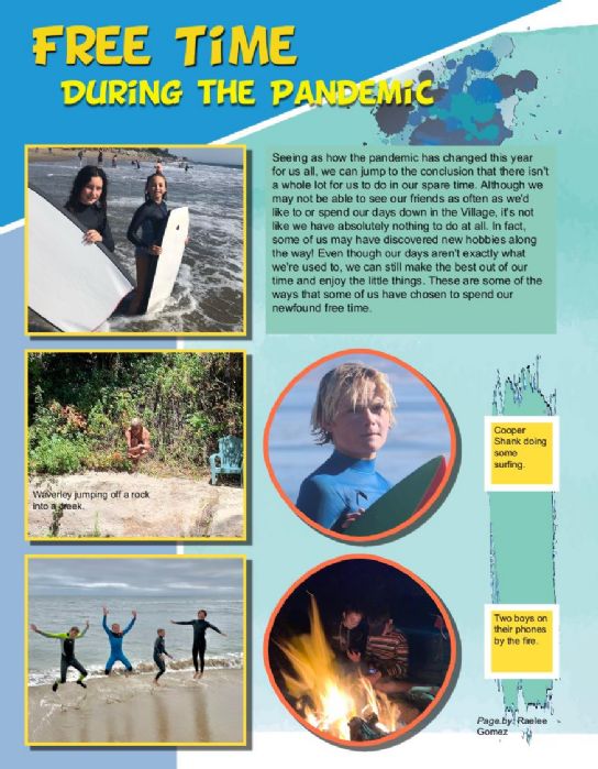 Entry Description: I wanted to design a page that showed how NBMS students had been enjoying their free time. Many students would go surfing, play some sports, or make plans with friends. I was inspired by everyone having a good time and making new memories even though we are dealing with a pandemic.