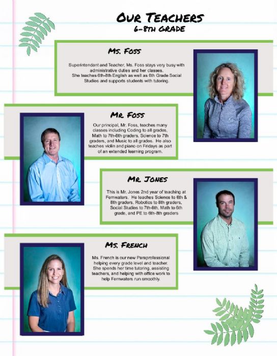 Entry Description: This page was meant to show the many things our multi-talented teachers bring the the school, alongside the many new features added to the school this year. It also highlights a survey question to the students incorporating our theme "The way we see it". The ferns in the corners of the first page is a nod to our school name, Fernwaters.