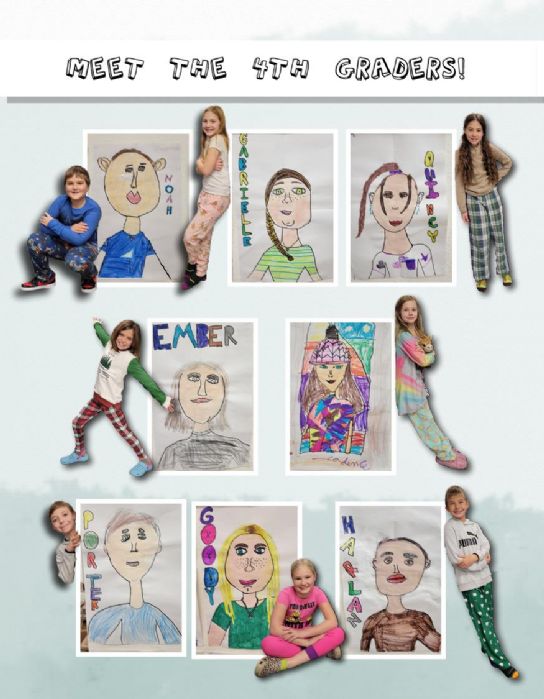Entry Description: The kids created self portraits which were so special and also funny because of what they chose to highlight about themselves. All the 4th graders are new to our school so we thought showing their self-portraits along with a picture of them being silly was a great way to get to know them better.
