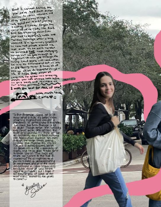Entry Description: Due to the theme of the book being Vogue, the design of the page was inspired by the look of a magazine, where the lettering/fonts tend to call the attention of the audience, and graphic design elements intervening in the photograph make the page more appealing and unique. This page was also selected to be a letter from the directors as it is an ongoing tradition at the school to do so every year, as the senior directors leave the graduating class a message that encompasses the graduating class' experience.